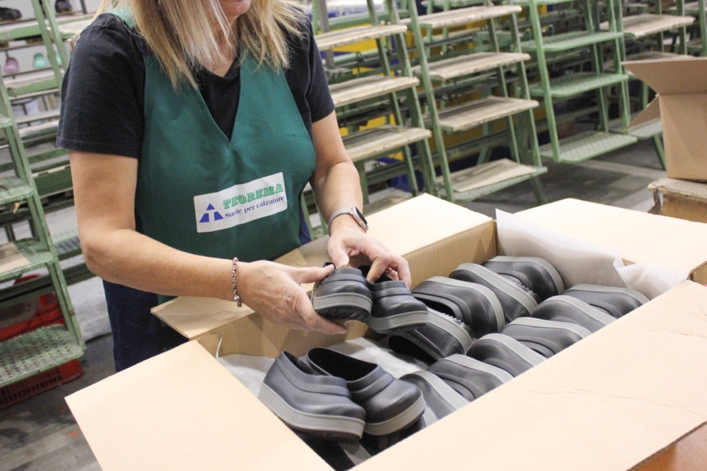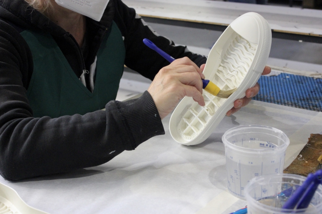 Nel nostro reparto dedicato all’incollaggio realizziamo l’assemblaggio di suole e componenti — spoiler, inserti, battistrada — selezionando prodotti e cicli specifici in base al materiale e alla destinazione d’uso.