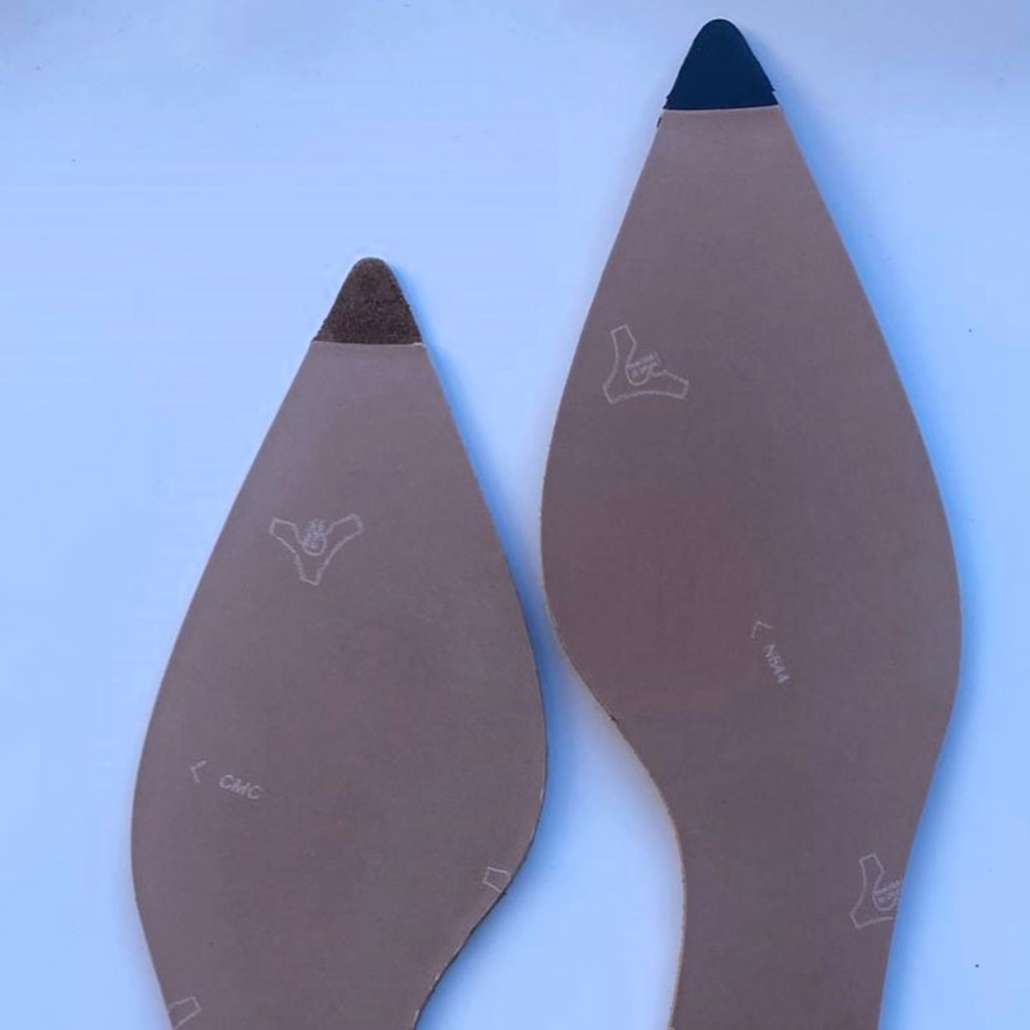 Suole realizzate con inserto in cuoio, lavorate tramite fresatura per ottenere precisione, pulizia dei bordi e un profilo estetico raffinato. L’iniezione del cuoio nella struttura della suola permette di integrare il materiale in modo stabile e resistente, garantendo un connubio ideale tra tradizione e tecnologia.